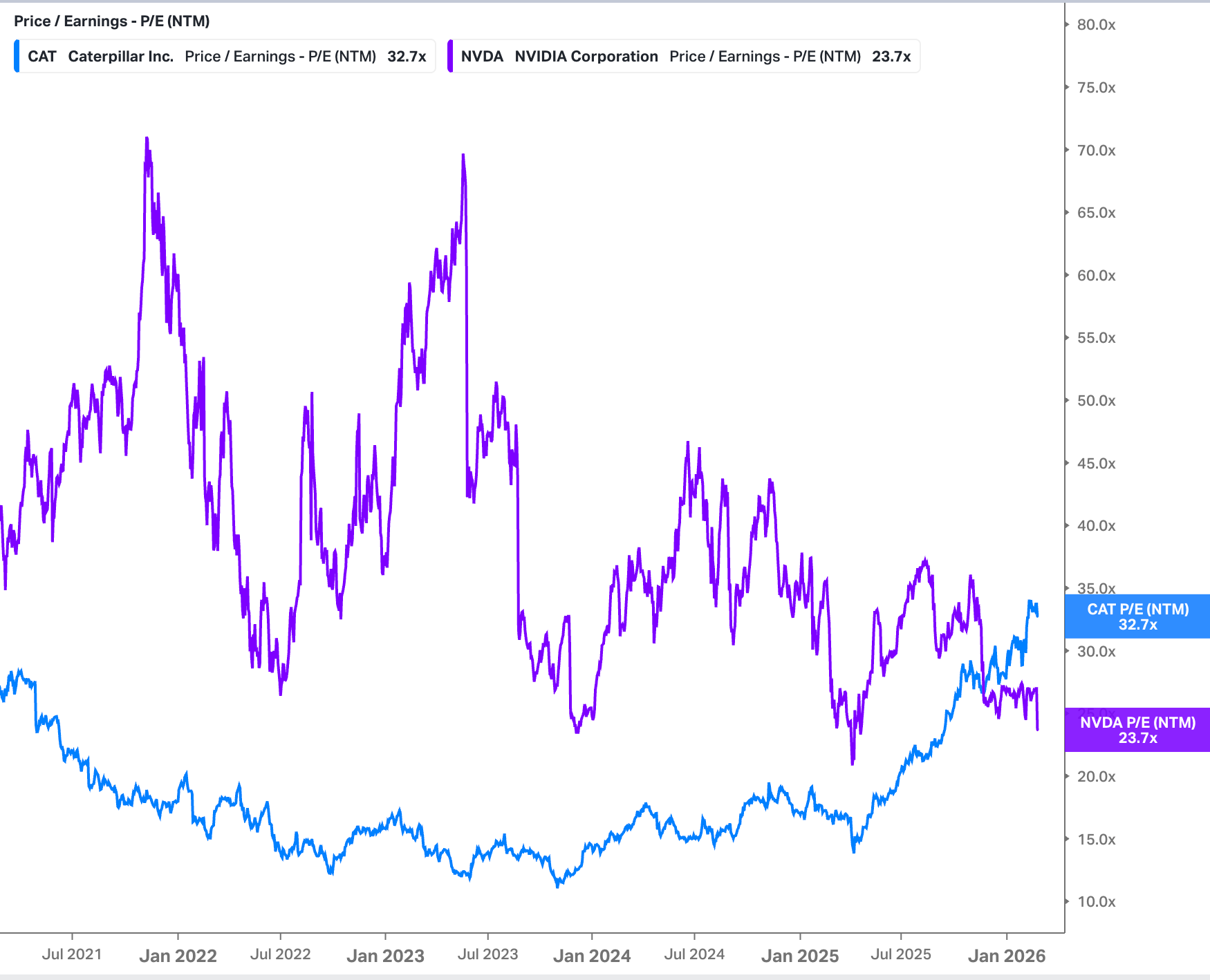 When an investor opens their terminal today, they are confronted with a staggering anomaly: Caterpillar, a century-old manufacturer of 400-ton machines, is trading at valuation multiples that don’t just rival the semiconductor elite - they are beginning to eclipse them. In certain momentum-driven windows, CAT’s forward-looking P/E ratio has actually punched through the levels of NVIDIA, the undisputed king of the AI era. Even more confounding is that CAT is now commanding a “scarcity premium” that puts it on par with high-growth SaaS darlings after their meltdown.