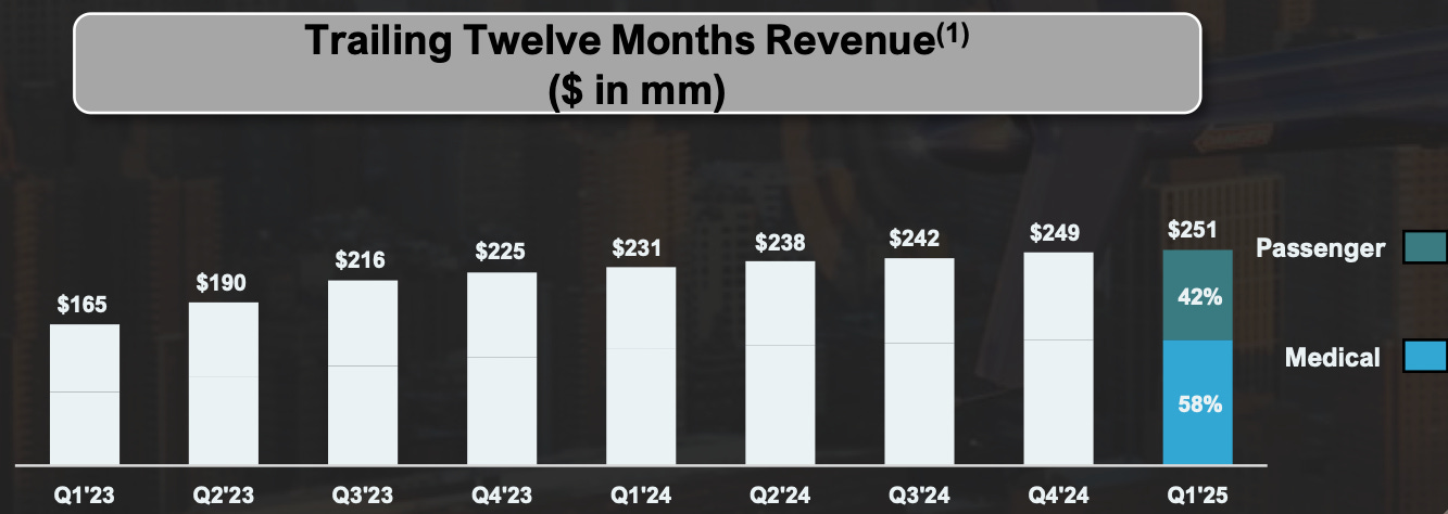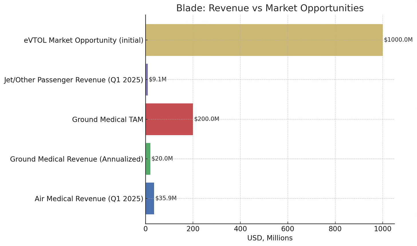 It’s also important to clarify that Blade's $35.9 million in Q1 2025 medical revenue refers specifically to its air transport business. Separately, its ground transport segment—which involves vans and ambulances—brought in around $5 million this quarter, or $20 million on an annualized basis. These are two distinct, though complementary, revenue streams.