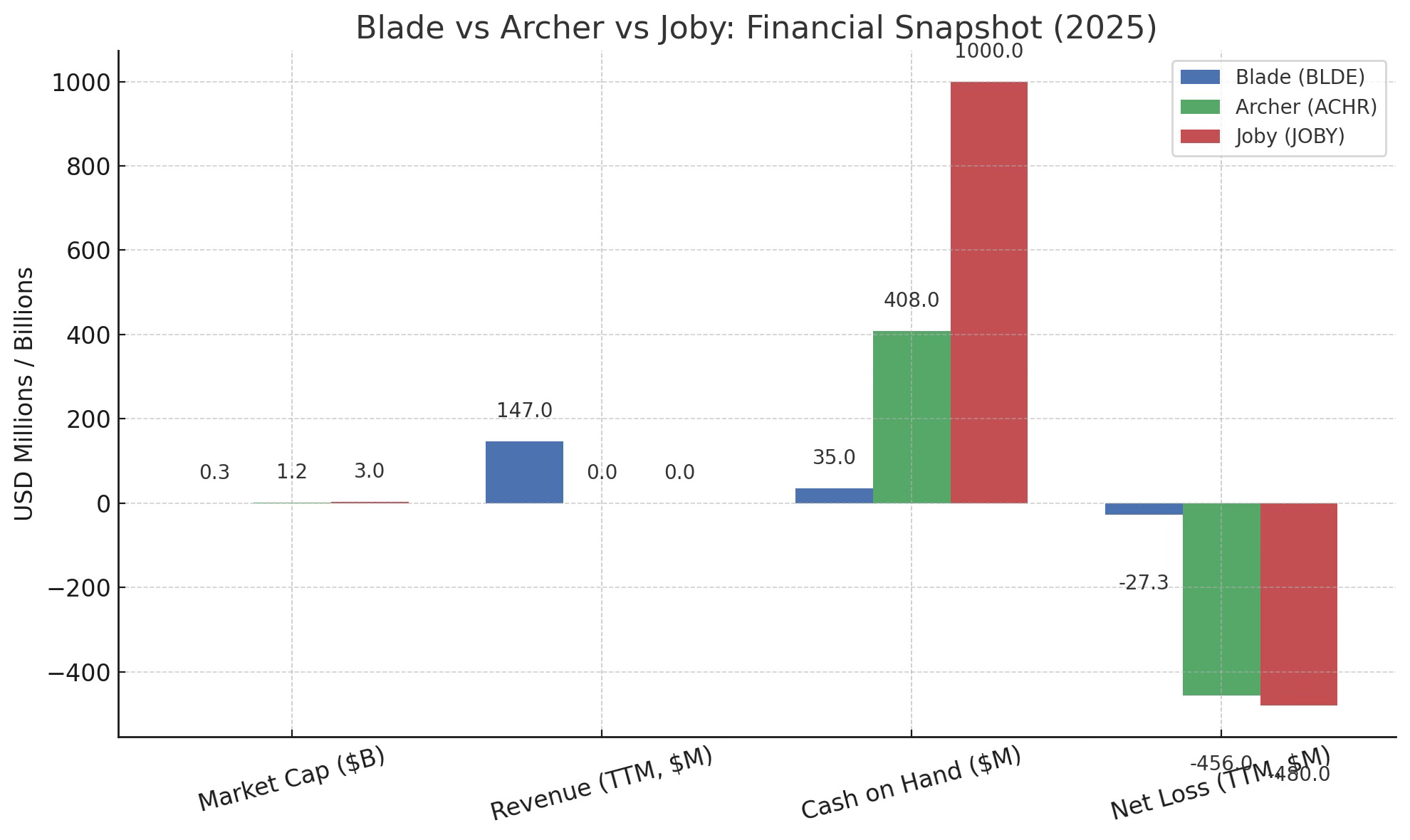 Unlike Blade, which operates with tight budgets and real revenue, Archer and Joby raised billions through SPACs in 2021. Joby has over $1B in cash, backed by Toyota and Delta. Archer raised over $1.1B and secured a $125M investment from United Airlines.