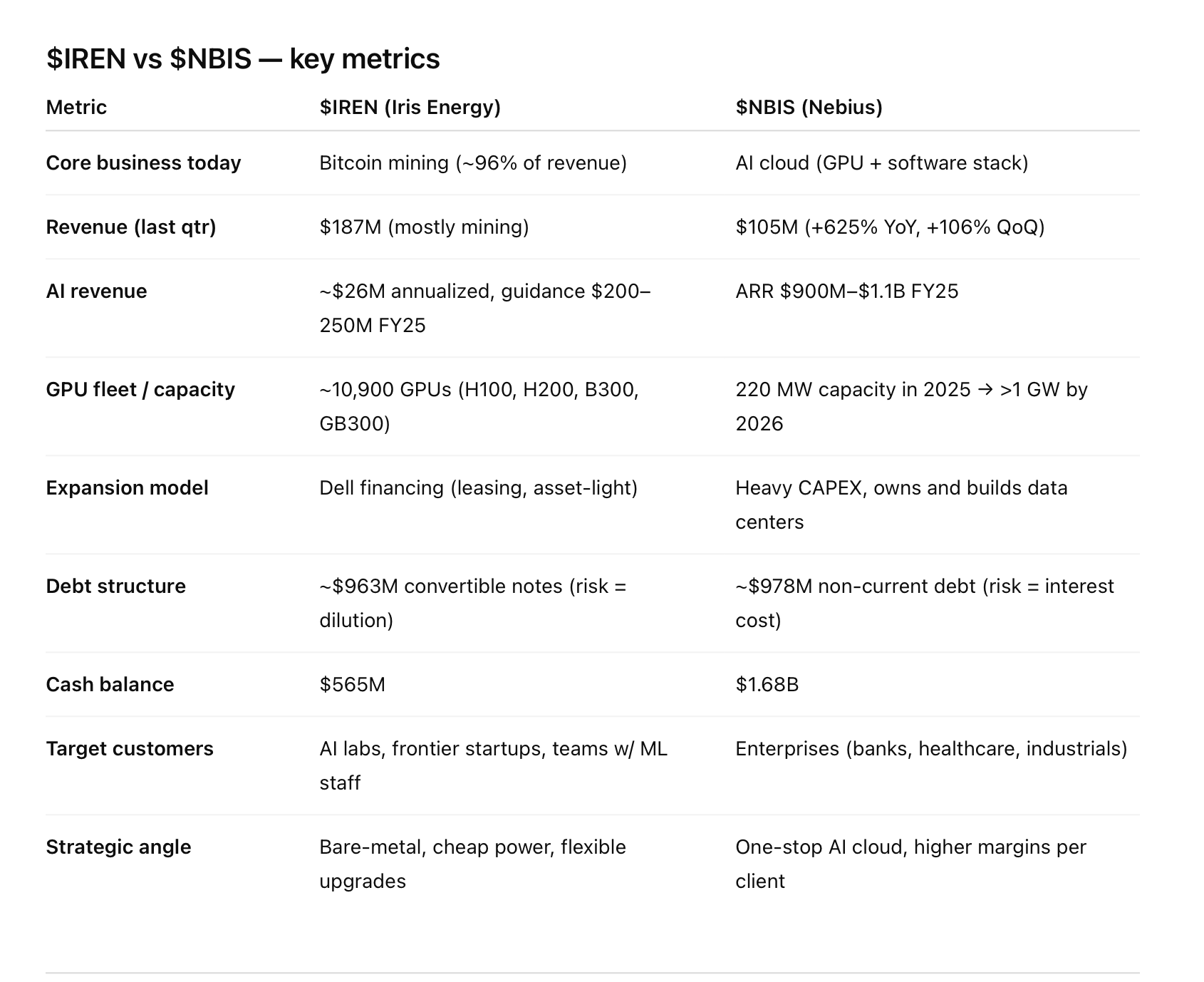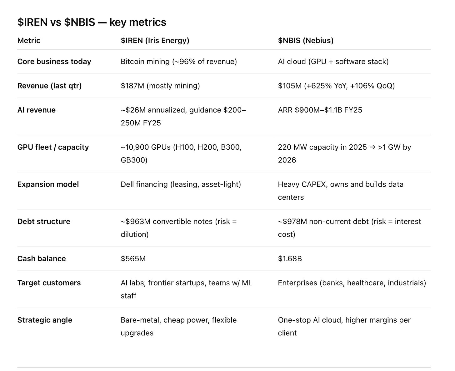 After $IREN’s strong earnings, many investors started to compare it with $NBIS and debate who will grow faster. On the surface it makes sense — both are plays on AI infrastructure. But the reality is that their monetization models are very different.