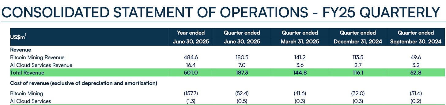 $187M revenue in Q4 FY25, with net income of $176.9M — still overwhelmingly from mining, but showing the profit engine they want to replicate in AI.
