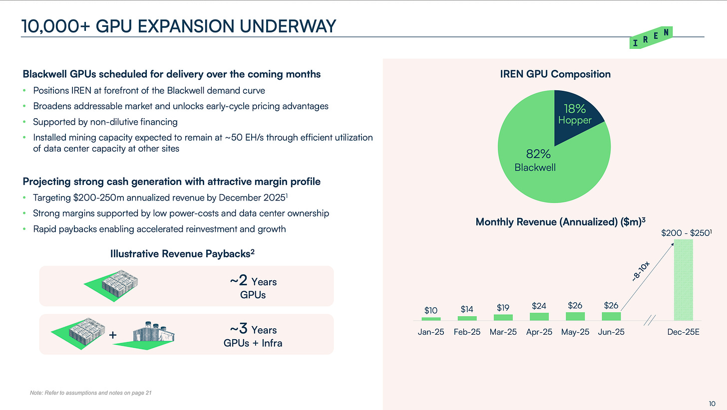 Today, 96% of IREN’s revenue still comes from bitcoin mining, but the GPU business is scaling quickly. The Dell financing partnership allows them to expand without heavy balance sheet dilution.