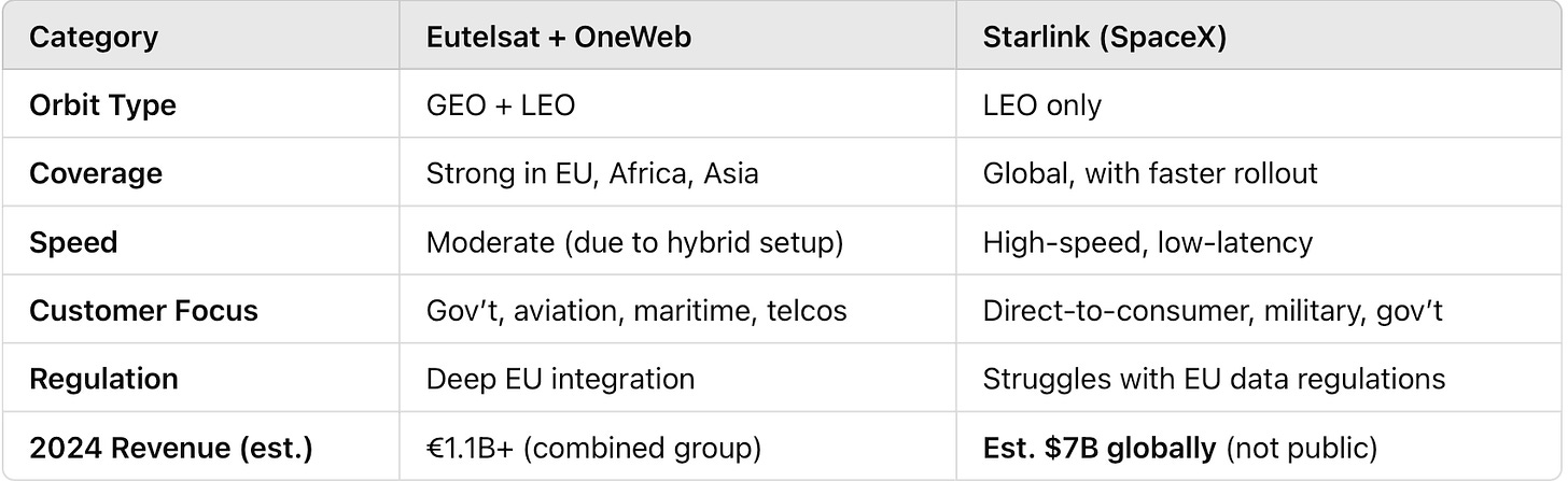 Eutelsat has around 650 LEO satellites (via OneWeb acquisition in 2023), compared to Starlink’s 7,000+.