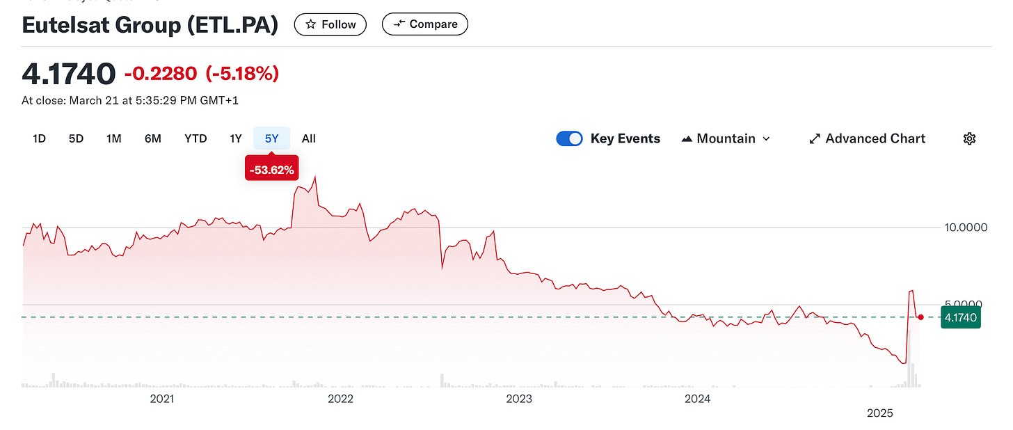 In February the company’s stock plummeted after its earnings report. The steep decline was driven by a €535 million goodwill impairment on its GEO assets—reflecting lower expected future cash flows in a market shifting decisively toward LEO system. On March 6, Fitch downgraded Eutelsat to “BB” from “BB+”.