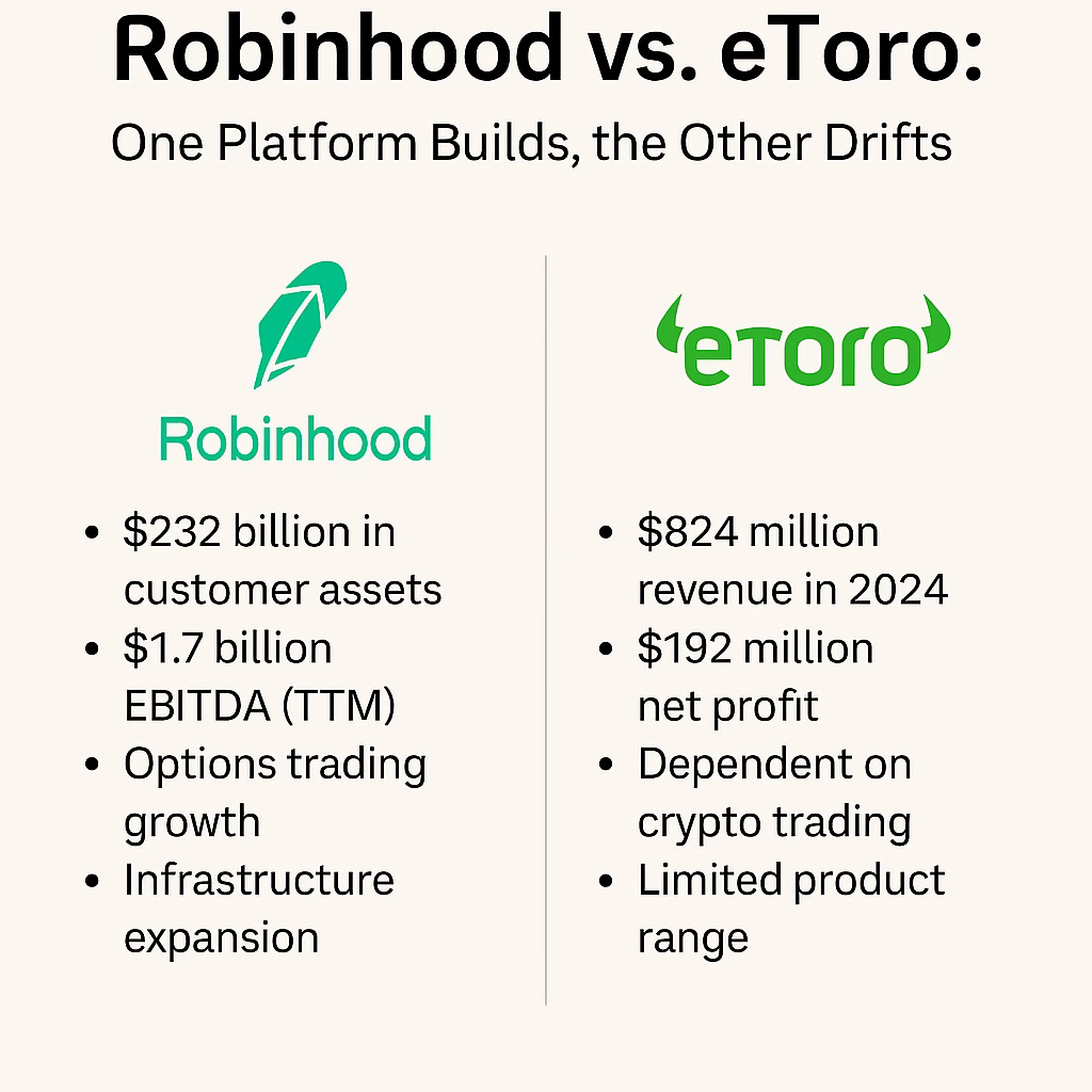 In 2025, retail brokerage is not a feature — it's a fight for infrastructure dominance. Robinhood and eToro may appear to play in the same sandbox, but their business models, product strategies, and market trajectories are fundamentally misaligned.