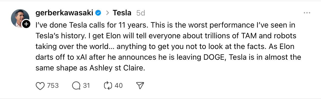 On April 22, Tesla — Musk’s primary cash cow — posted disastrous Q1 results. Revenue from car sales collapsed by 20% year-over-year, the worst decline in the company's history. Profit plunged by 70%, falling to $400 million. If not for $595 million in environmental regulatory credits (ironically created by the Democrats Musk claims to despise), Tesla would have reported a loss. These credits still deliver up to $2 billion in annual revenue. Ross Gerber invested in Tesla for many years and turned bearish