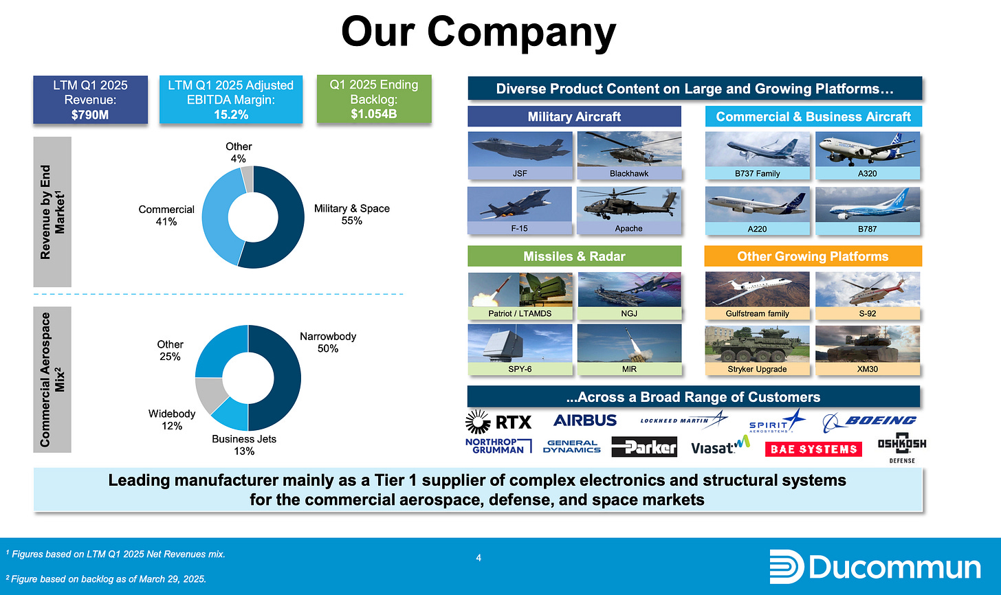 Ducommun operates in two segments — Structural Systems and Electronic Systems — both of which are indispensable to modern military and aerospace platforms.