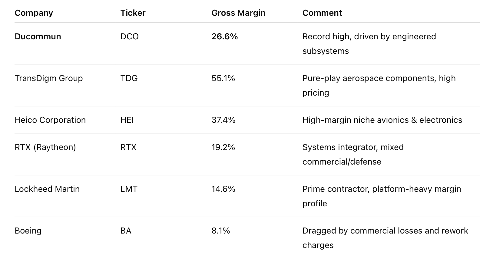 Ducommun doesn’t match the 50%+ profile of TransDigm — few do — but it outpaces every Tier-1 integrator, while retaining a smaller-cap valuation and deeper embeddedness in platform internals.
