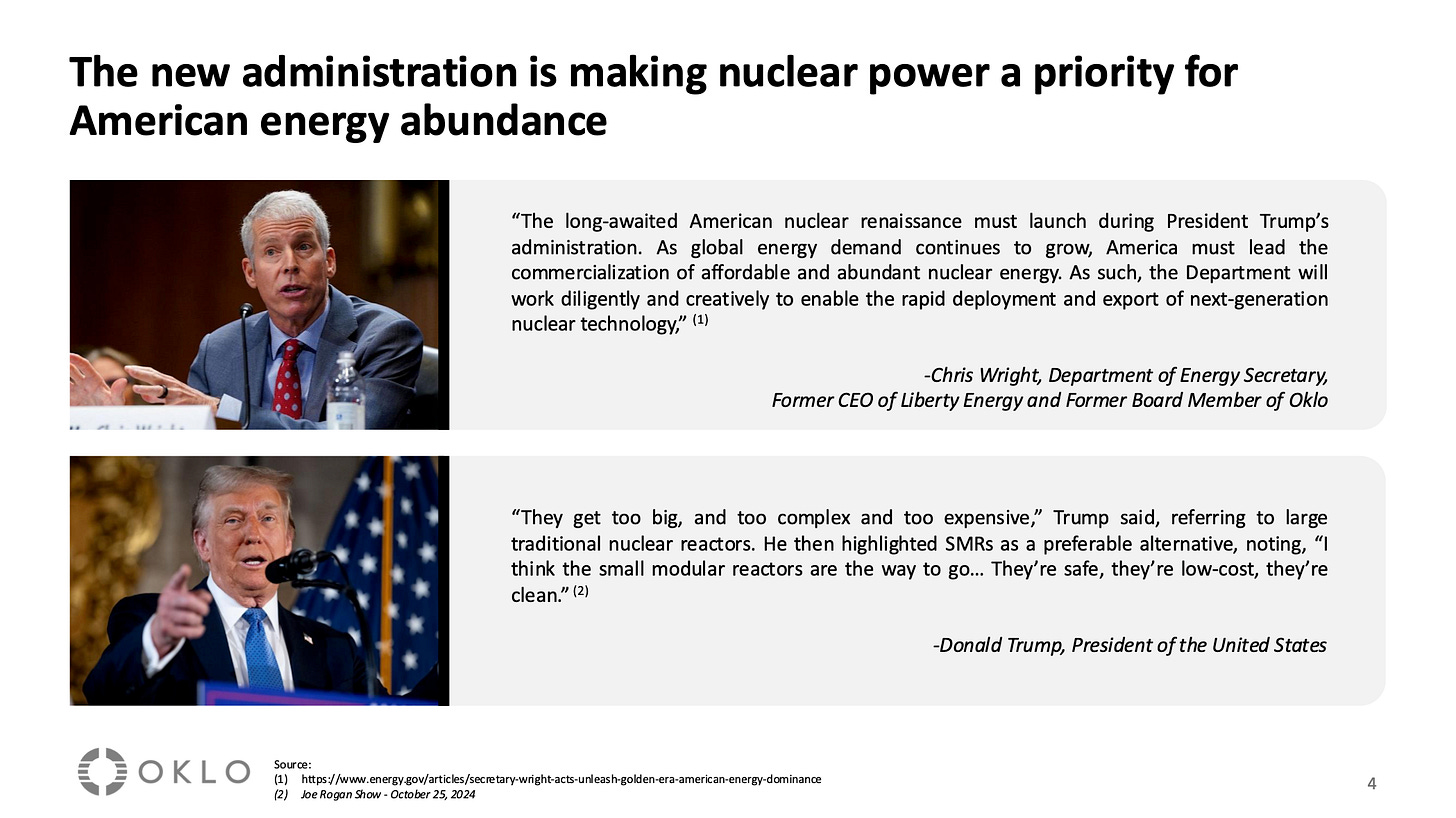 What's the secret? The company has two powerful resources. Nuclear power and nuclear lobby. Most companies of its size can only dream of the people who can regularly meet president Trump in person. He's the first official you'll see in Oklo presentation, below current Energy Secretaary Chris Wright.